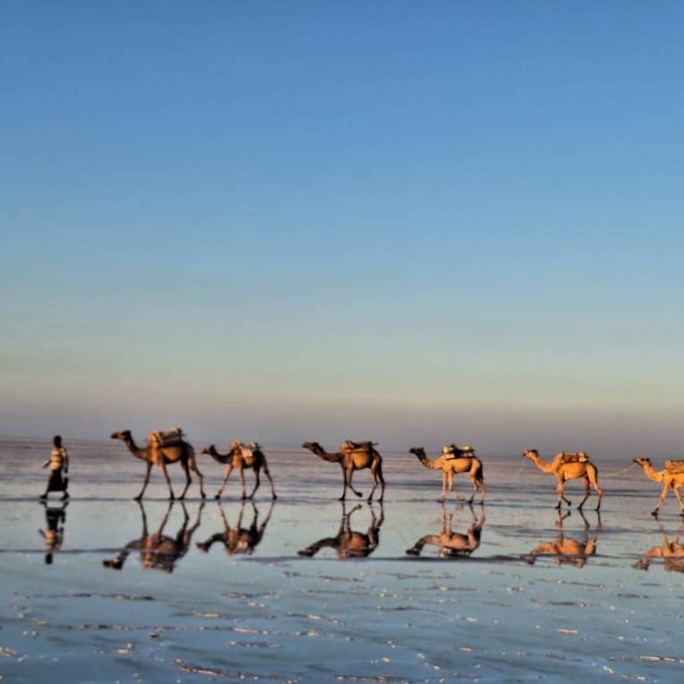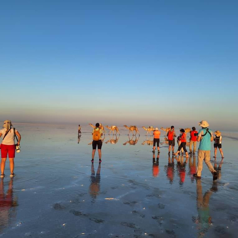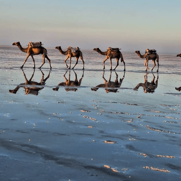 Morning tour Drive to Ragad (Asebo), the place where the localities are mining salt. Look the activity of workers breaking salts from the ground, cutting in to rectangular pieces and loading on the famous long camel caravans. You drive ahead to Dallol and visit the moonlike landscape formed by volcanic activity in its lurid, florescent colours where salt mining also takes place. Visit Lake Assal and follow the camel caravans (please note that NO camel caravans are likely to be active during July, August and early September), walking and talking with the Afar people.