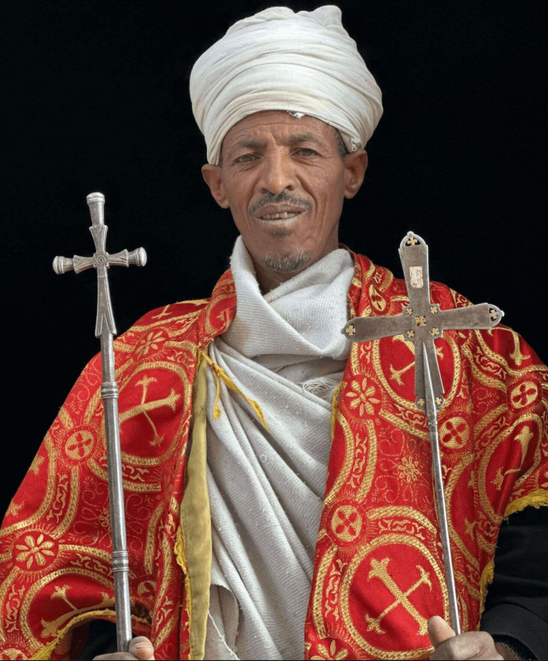 Cloaked in ceremonial velvet and satin robes and carrying sequined umbrellas, priests march and dance carrying replicas of the Arc of the Covenant from nearby churches to a source of water where blessings are dispensed on the gathered crowd. The priests achieve a state of ecstasy through the drumming and chants that is often contagious to the white robed worshipers who gather around them.