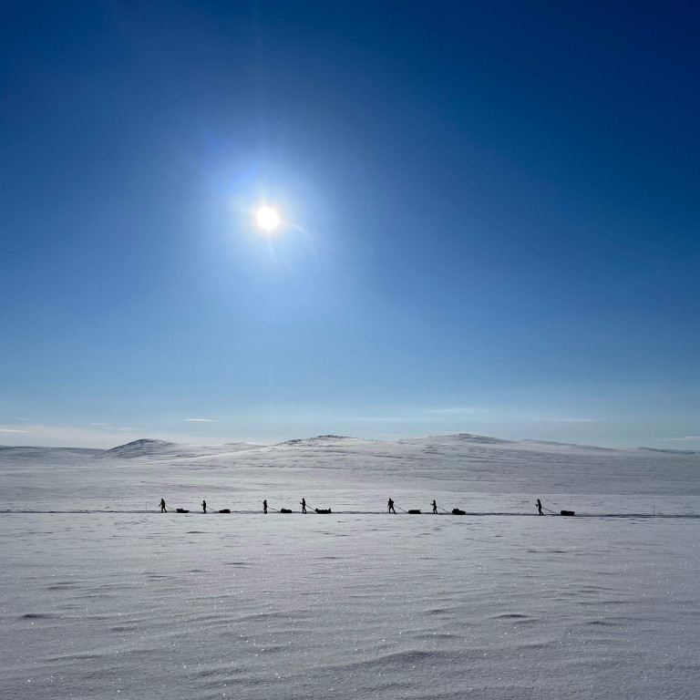 Starting in the serene winter village of Ylläs, home to our friendly and experienced tour hosts, the journey takes you north to Kilpisjärvi where the road ends and the wilderness begins. With pulkas packed and fell skis underfoot, you’ll set out into the vast expanse of Arctic tundra, traversing frozen lakes, ascending wild fells, and navigating your own path across untouched snow.