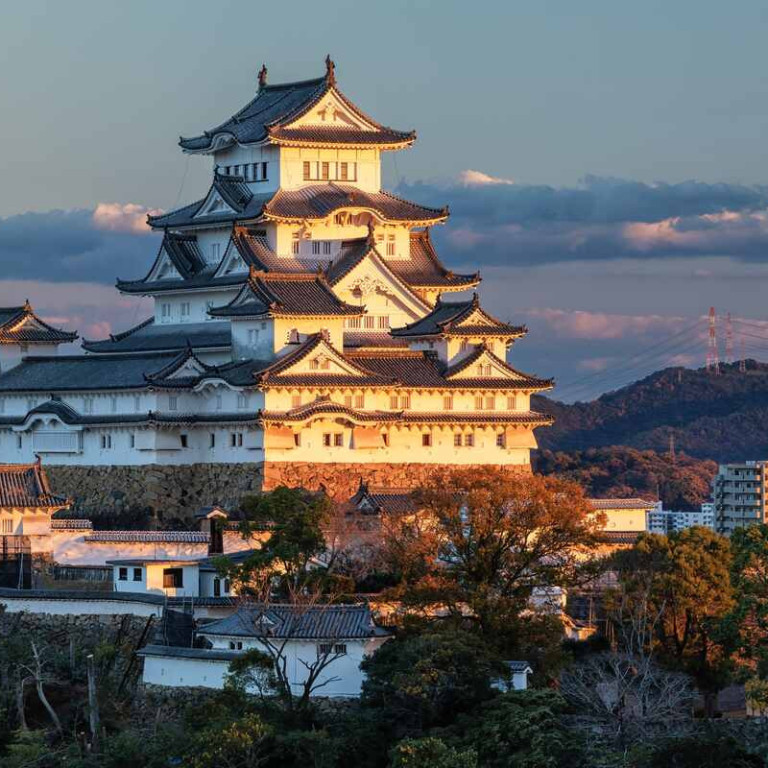 Between Kyoto and Okayama stand the iconic white castle walls of Himeji, also known as the 'White Heron Castle' dating back over 600 years, it is regarded as the finest surviving example of Japanese castle architecture, comprising a network of 83 rooms with advanced defensive systems from the feudal period. The castle gardens, comprising of nine separate walled gardens were built in the Edo Period, and are especially famous for their Sakura cherry blossoms, blooming only once for about a week in a year; they epitomise the 'wabi-sabi' mentality.