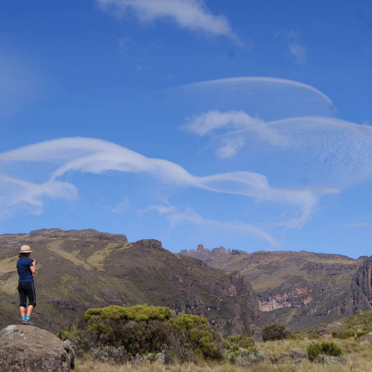The walk starts with spectacular views of the rolling hills ahead and perhaps even a glimpse of the snow- capped peaks of Batian (5,199m) and Nelion (5,188m) high above.