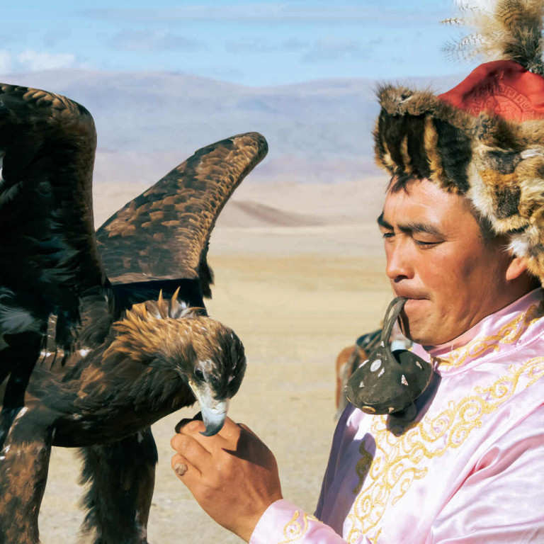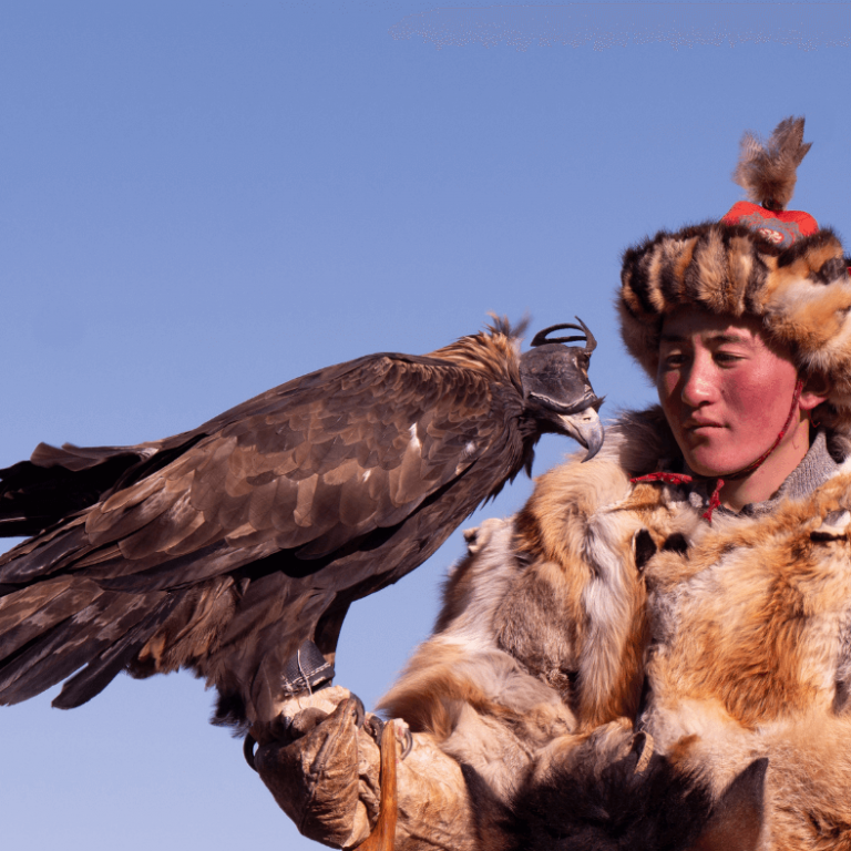 Fly to Ulgii, the cultural heart of Mongolia’s Bayan-Ulgii province, home to the Kazakh community and their centuries-old traditions. On arrival, meet your local team and transfer to Sagsai village, where you’ll be welcomed into the world of Golden Eagle hunting. In the snow-covered landscape, witness skilled Berkutchi take to the mountains with their eagles, continuing a proud winter tradition. You’ll stay with a local Kazakh family for a deeply authentic and personal experience.
