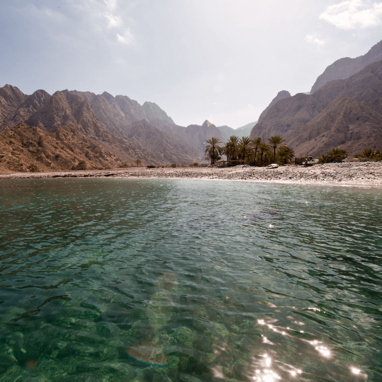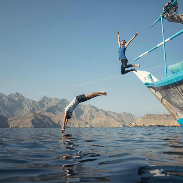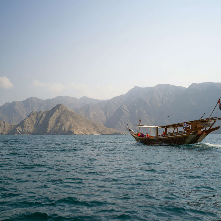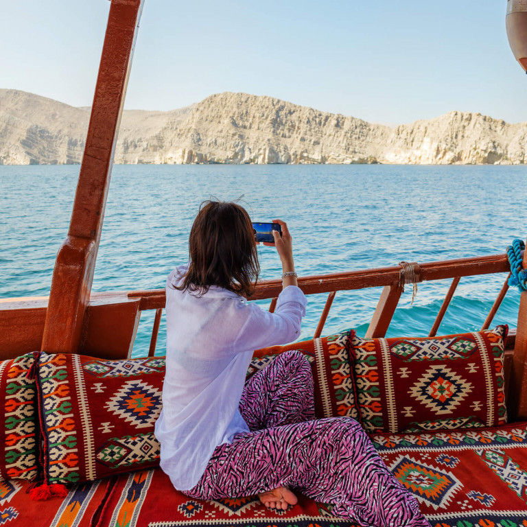Set sail on a full-day cruise aboard our traditionally decorated wooden dhow through the stunning azure waters of the fjord (Khor Sham). Surrounded by spectacular mountains and small white sandy beaches, the majestic fjord offers breathtaking scenery at every turn. At the entrance of the fjord, enjoy the chance to watch dolphins in their natural habitat. The dhow will anchor near Telegraph and Seebi Islands, where you can swim in pristine waters alongside colorful fish.