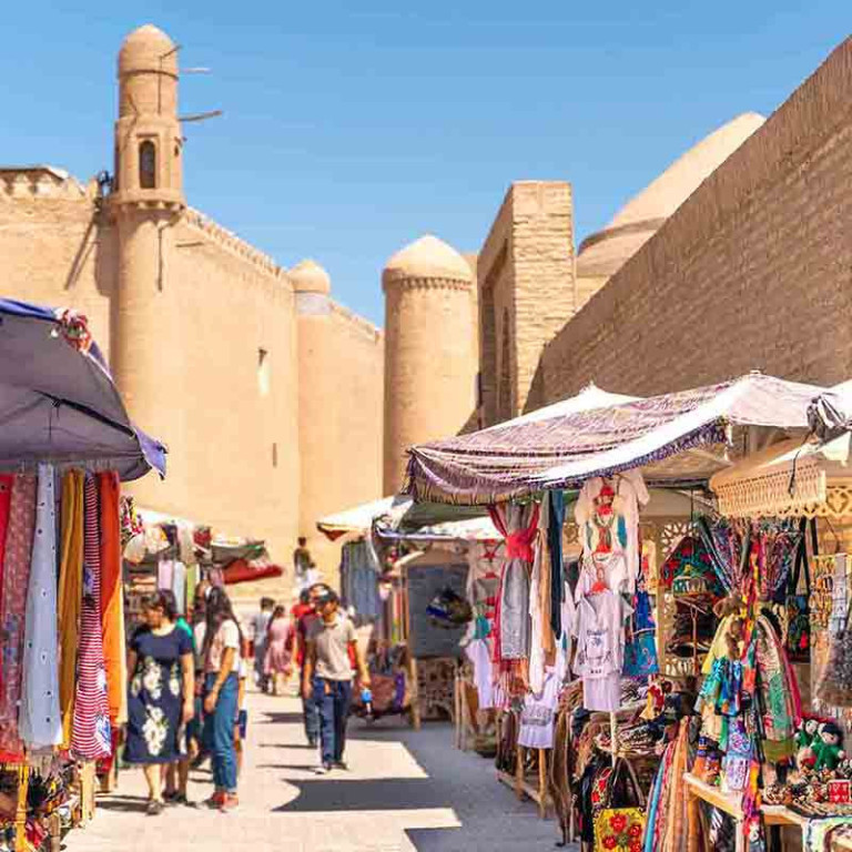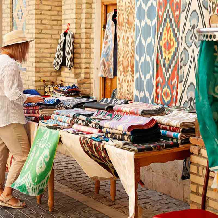 Visit the local bazaars housed in the restored ‘trading domes’ of the 14th to 17th century: Tok-i-Zargaron; Jeweler’s bazaar, Tok-i-Tilpak Furushon; the Cap-Maker’s Bazaar, Tok-i-Sarrafon; the Moneychanger’s Bazaar; Madrassah of Ulugbek was built during the time of Ulugbek, in spite of its modest facade it differs from the rest because of its exquisite decoration. You will also visit the famous ceramic centre of Gijduvan (40km outside the city) and in Bukhara you will be guided to the famous Suzani fabrics and workshop. We end a glorious day enjoying a folk performance at the Nodir Divan Begi Madrassah before dinner at a local restaurant.