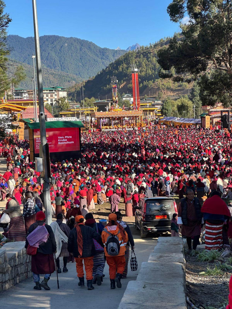 Most of the local peoples wear their traditional outfits – the men a kind of tartan-patterned kimono with white sleeves called a ‘goh’, the women an ankle-length dress of woven fabric in beautiful designs called a ‘kira’. All the monks in orange and burgundy robes sitting for hours praying and meditating at the festival.